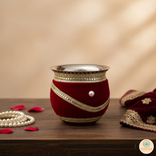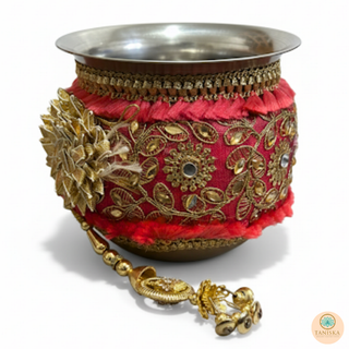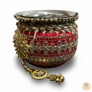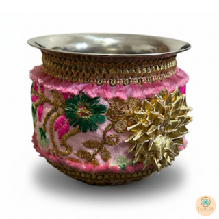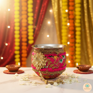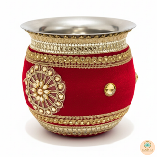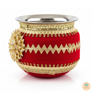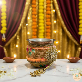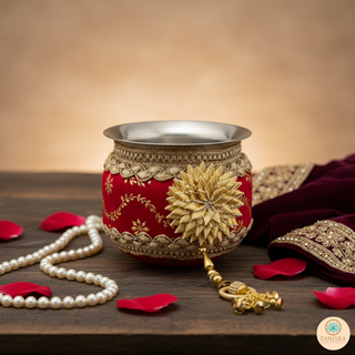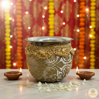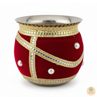 The Taniska Heritage Collection presents handcrafted ceremonial Gadvis and cups, blending durable stainless steel with rich, detailed embroidery and gold accents. Each piece embodies the vibrant tradition of the Gadvi and Cups, offering a unique statement piece for modern decor or special cultural celebrations.