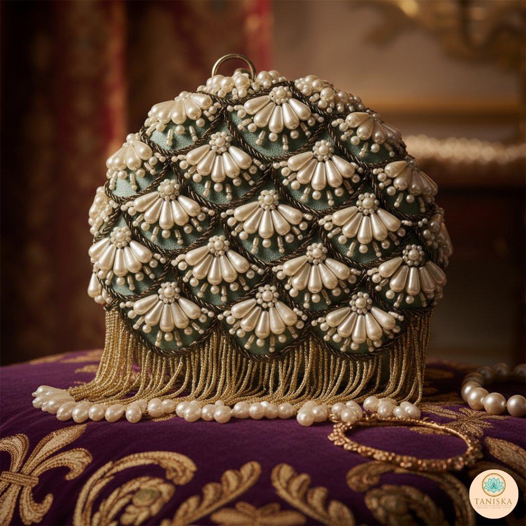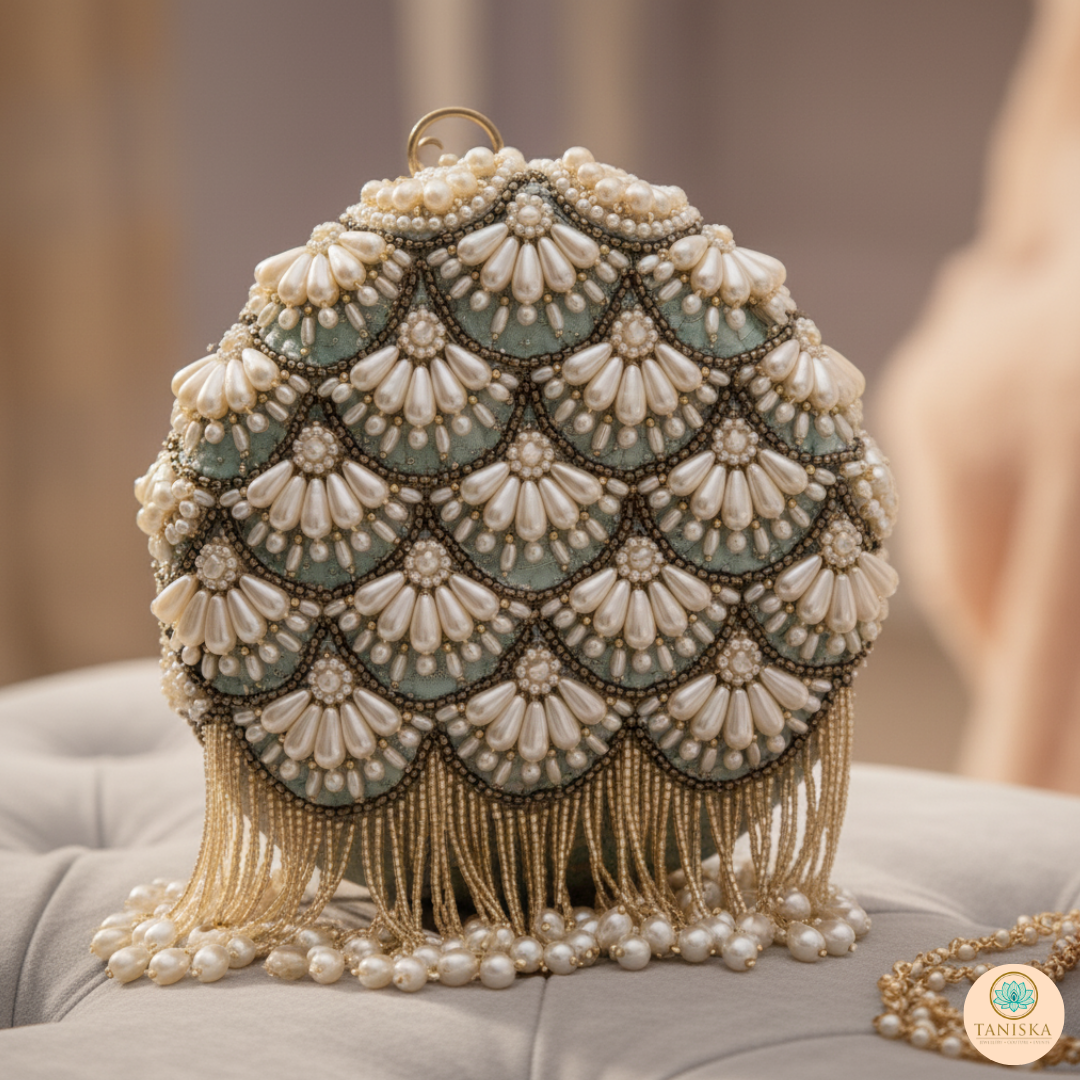 #PearlClutch #ArtisansTreasure #Taniska #IndianCrafts #Beadwork #PearlFringe #LuxuryClutch #WeddingFashion #MumbaiMade